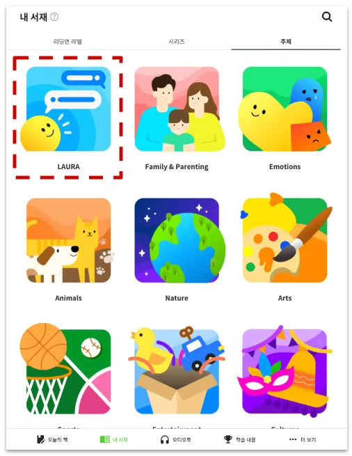 [리딩앤 앱 > 내 서재 > 주제탭 내 LAURA]를 클릭해 주시면 됩니다.