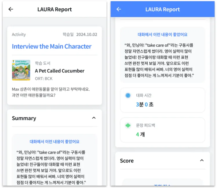 오늘 로라와 어떤 대화를 나누었는지, 대화에 대한 피드백, 발음 정확도 및 유창성 점수 등