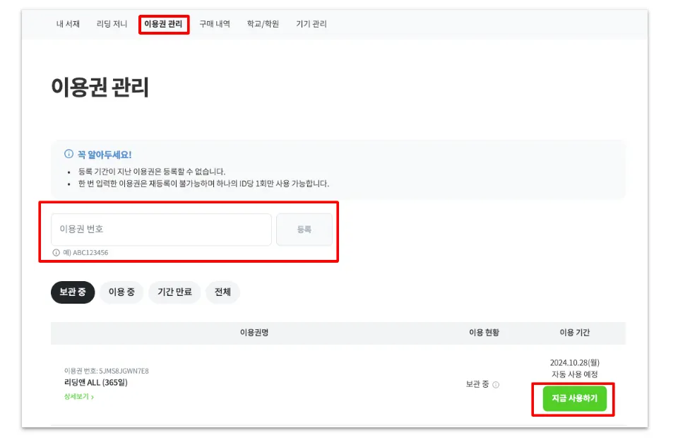 구매일로부터 6개월 동안 보관하기*가 가능하며 이용권 관리에서 '지금 사용하기'를 누르면 해당 시점부터 리딩이 활성화되어 정상적으로 이용 가능합니다.