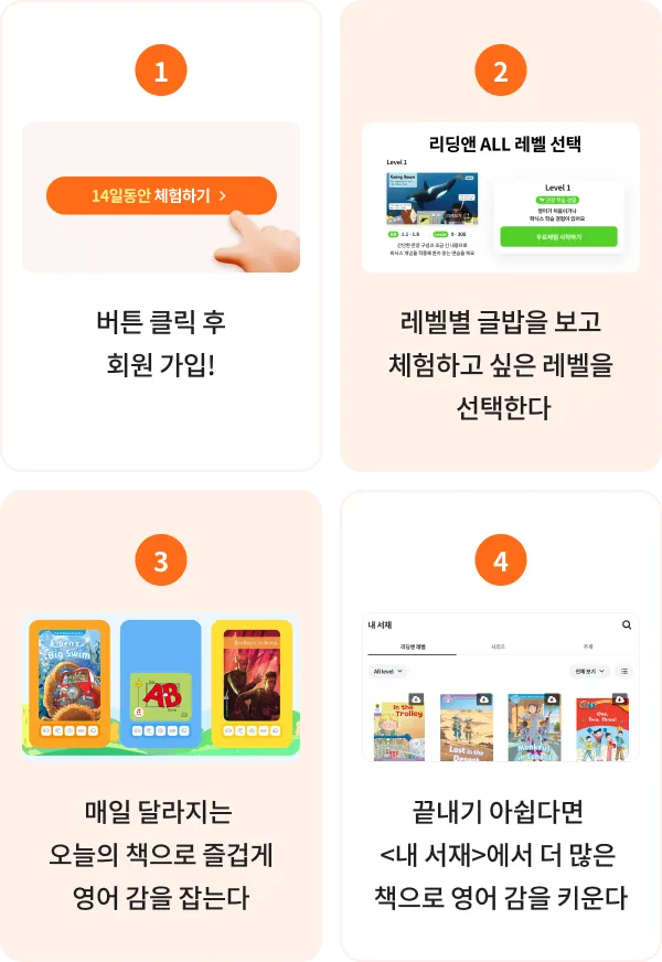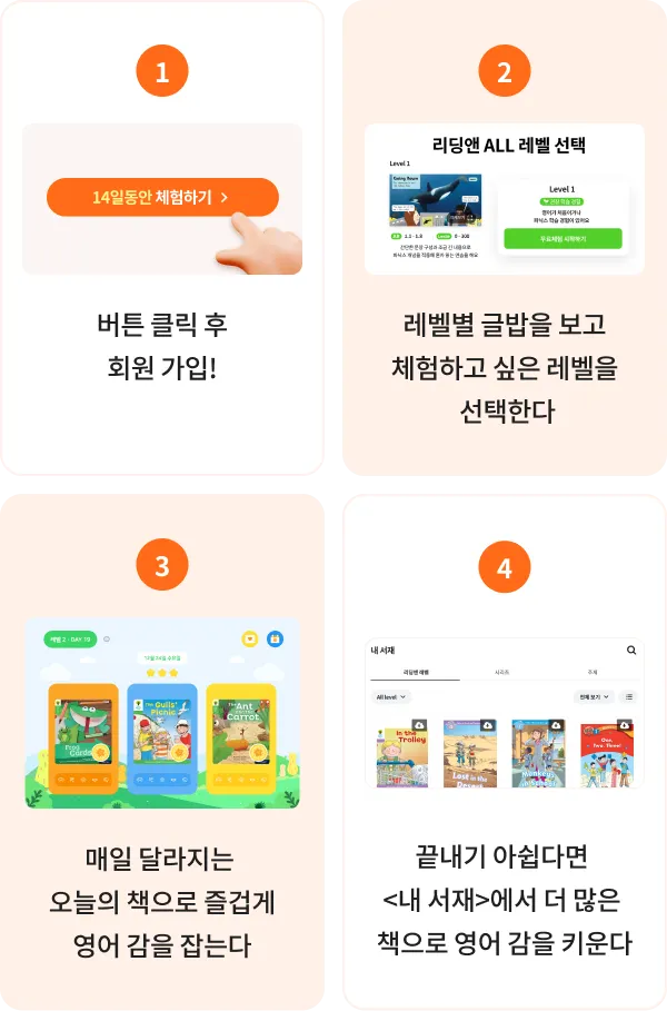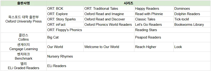 오랜 역사를 가진 출판사의 유명 리더스만 고르고 골랐습니다. 리딩앤의 여러 시리즈는 실제 대형 서점에서 판매되거나 아마존 도서 판매 1위를 하고 있는 책으로만 이루어져 있습니다.