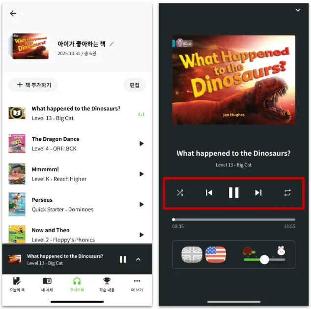하단에서 미국/영국 발음 선택(동시 지원이 되는 책에 한함)도 가능하고, 읽어주기 속도도 자유자재로 변경할 수 있습니다. 이 기능은 리딩앤 2단계 Listen up 기능과 동일하죠!