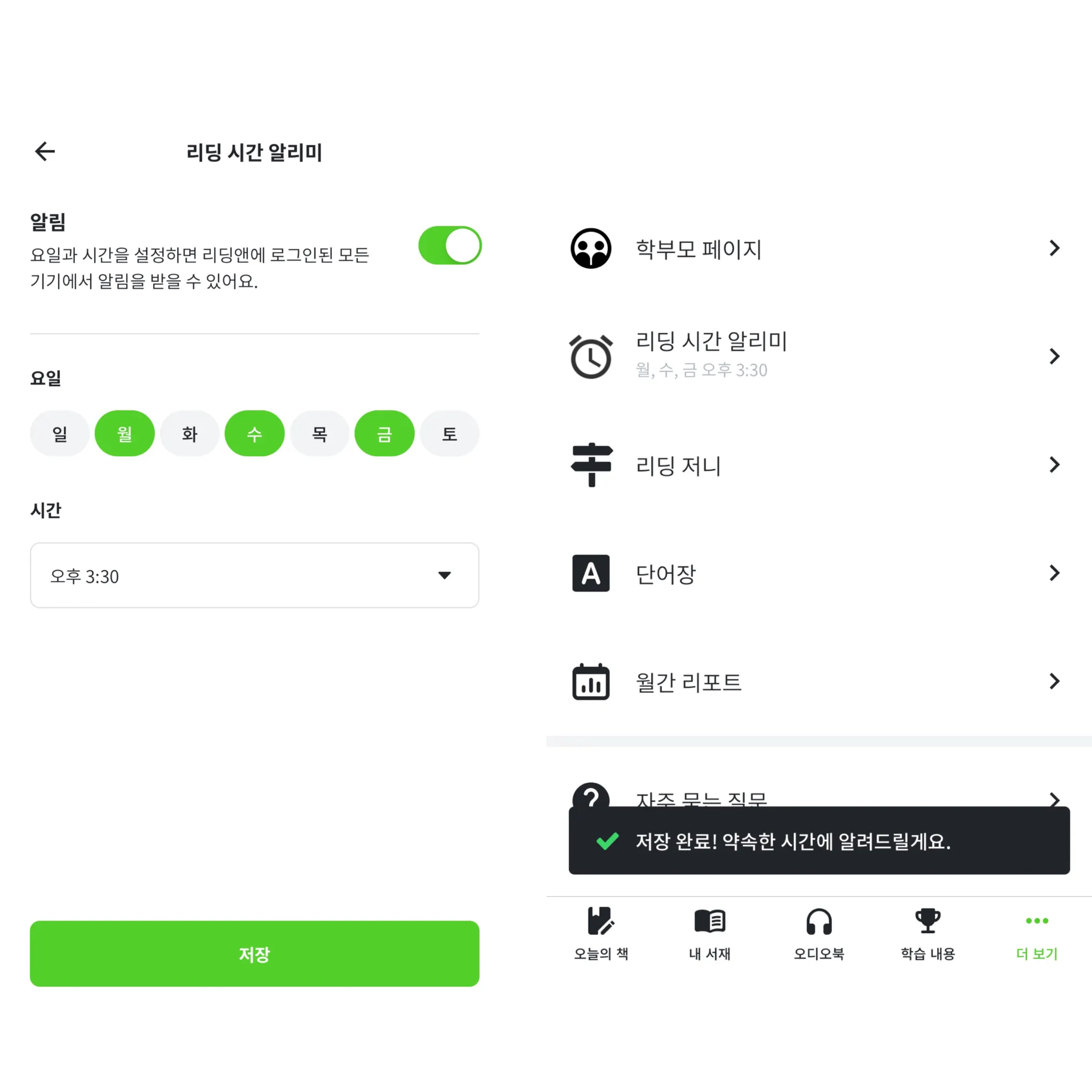 리딩 시간 알리미가 정해진 요일, 시간에 읽을 수 있도록 도와줄 거예요!