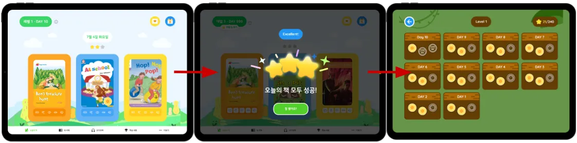 책을 꾸준히 읽을 수 있도록 독려하며, 추천 책을 리딩하면 별을 획득할 수 있어요.