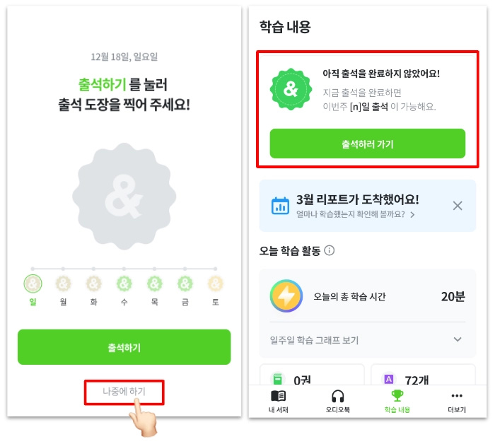 미뤄둔 출석은 앱 내 [학습내용] 메뉴에서 완료할 수 있어요.