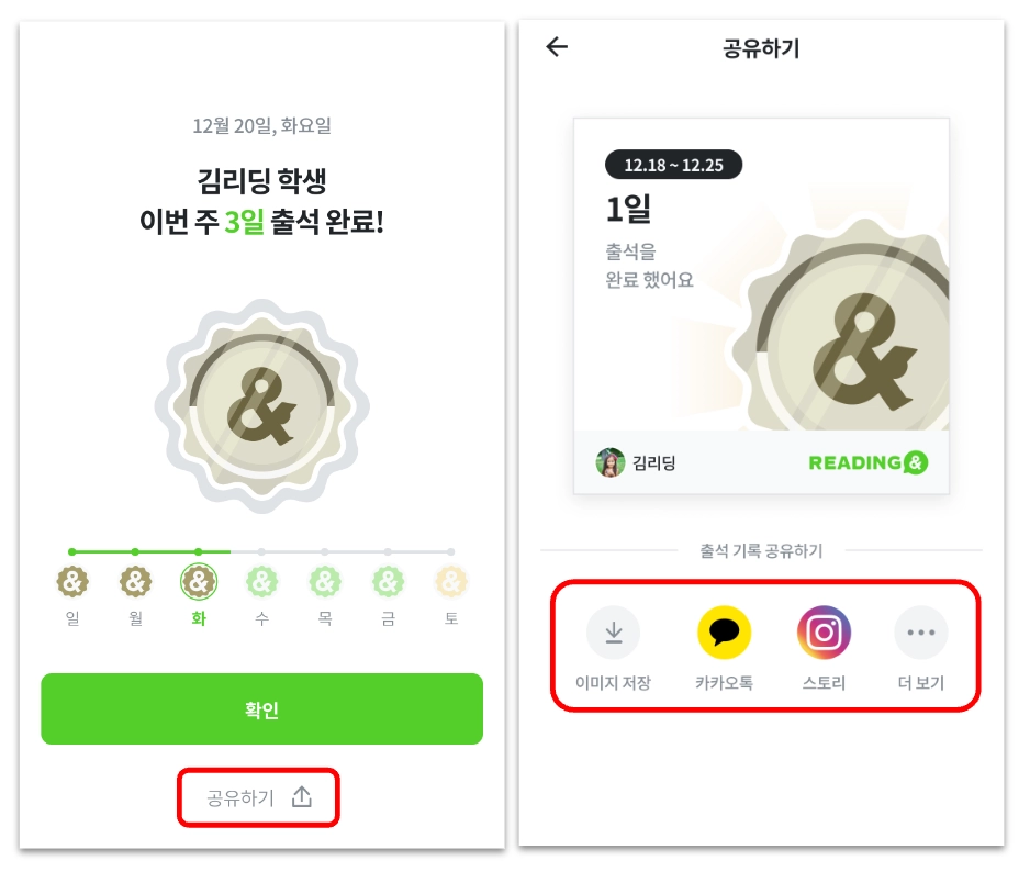 주간 공유 : [학습내용] or [출석체크]- [공유하기] 버튼을 누르면 SNS에 출석 기록을 공유할 수 있어요