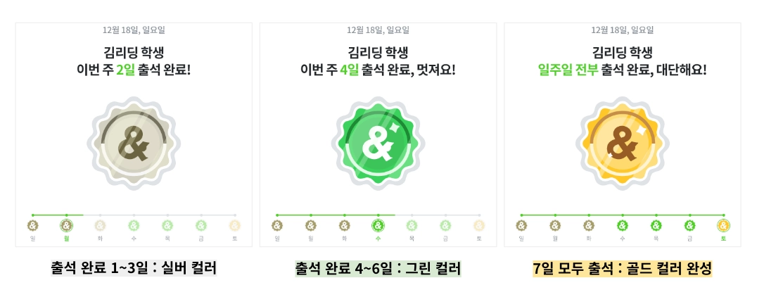 일주일을 모두 출석하고 멋진 골드 스탬프를 받아보세요!