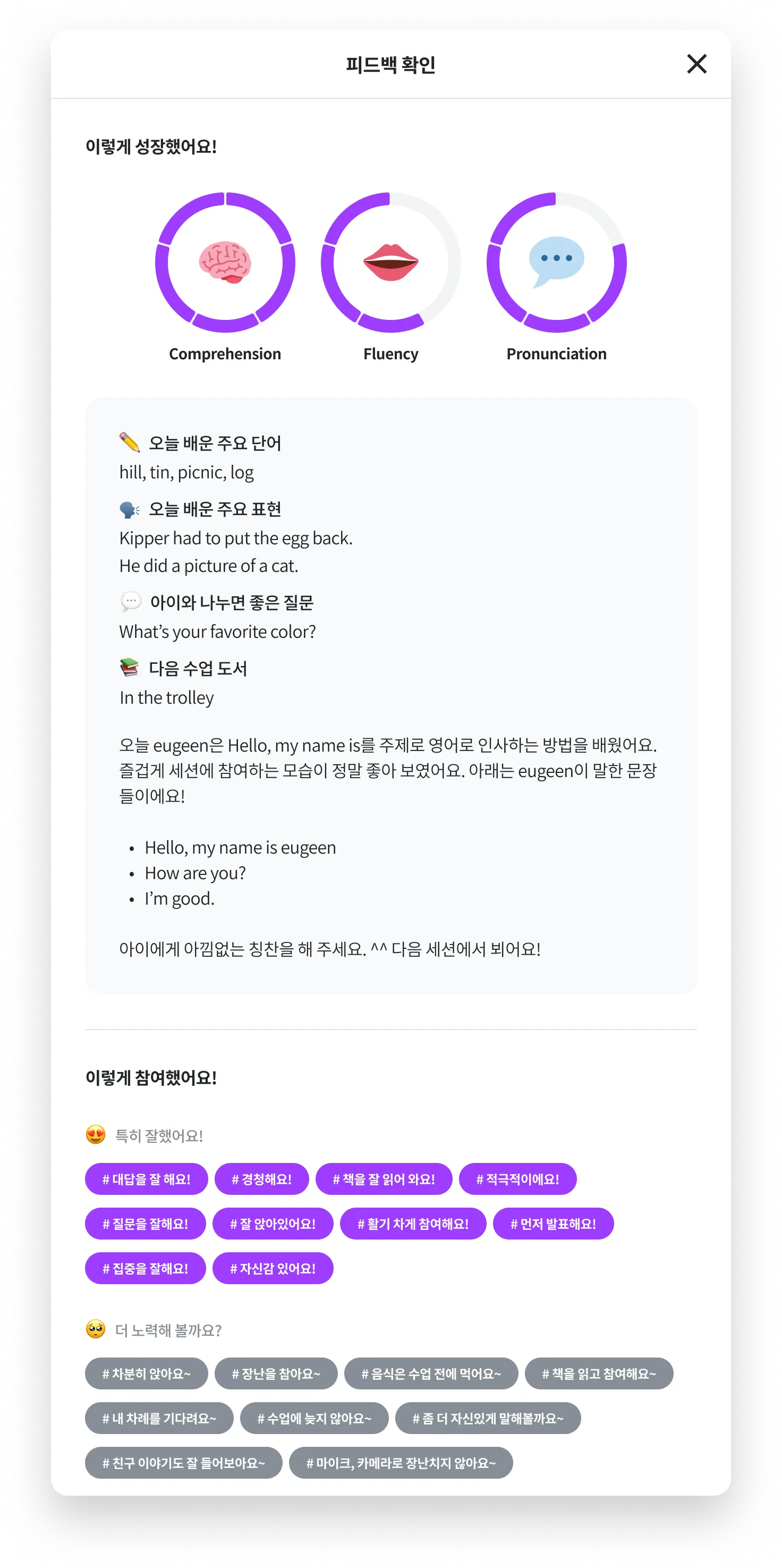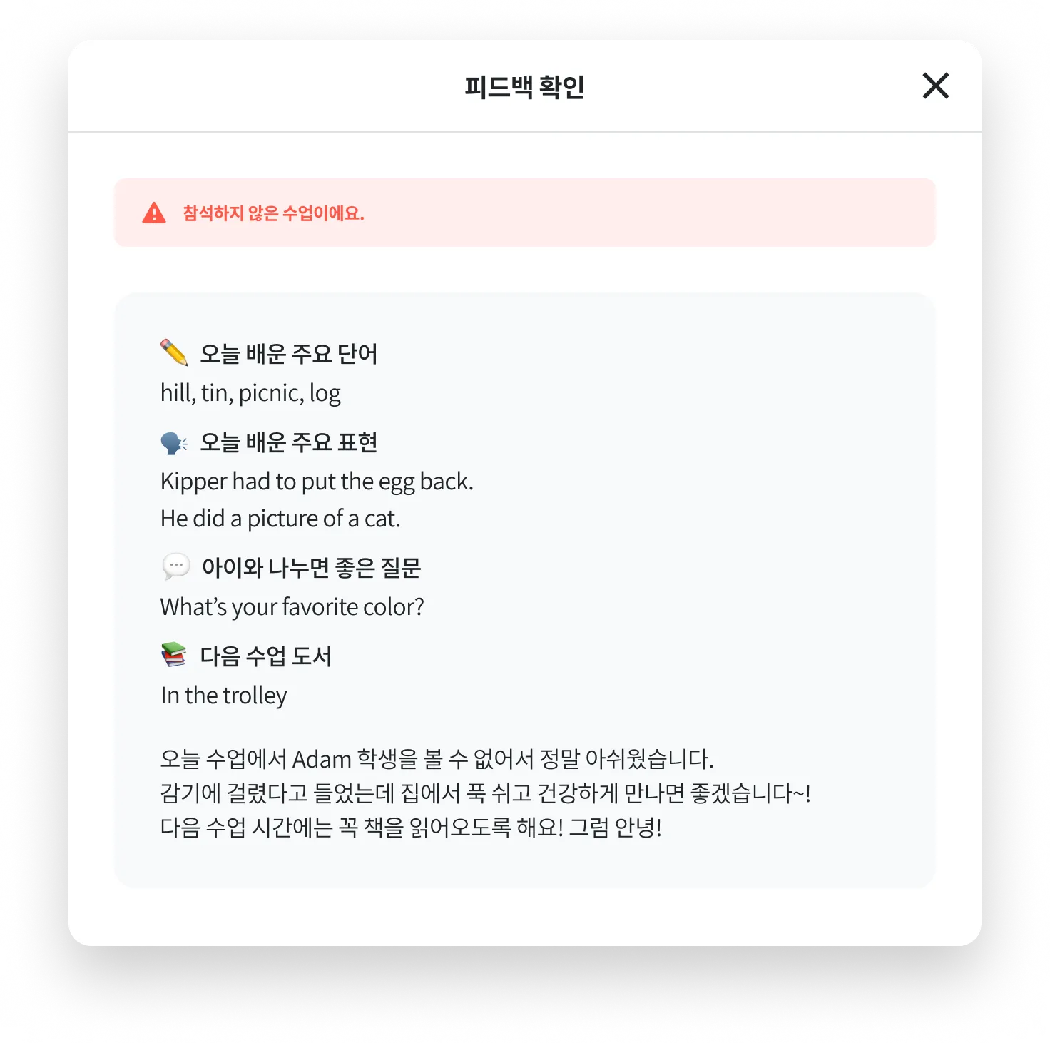→ 간단한 선생님 코멘트 또는 안부 인사를 확인할 수 있어요 :)