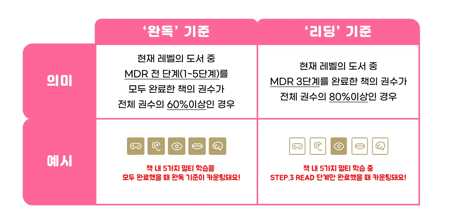 레벨업을 하기 위해서는 아래 두 가지 조건(’완독’ 기준 / ‘리딩’ 기준) 중 최소 한 가지 이상을 충족해야 해요.